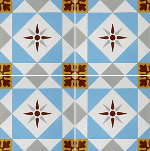 - Couleur: décor étoile bleu, gris, jaune, rouge – Les carreaux de ciment peuvent présenter des variantes de couleur dues au phénomène naturel de pigmentation.