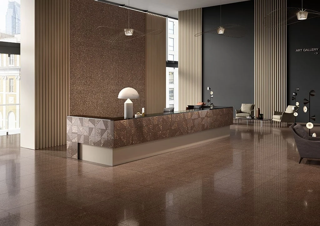 Cette nouvelle série en gros grain évoque les sols en grenaille, en offrant un produit extrêmement tendance en tonalités élégantes, discrètes et très contemporaines. En plus d’embellir les espaces, grâce à son esthétique recherchée, ALBURY est réalisée en grès 360°. Ce grès particulier est obtenu en mélangeant des pâtes colorées en profondeur, en différentes couleurs et offre un effet porphyrisé au support. Il favorise une grande valeur esthétique au produit, outre des prestations techniques supérieures. Idéale pour les applications dans des espaces résidentiels et commerciaux, en revêtement comme au sol.