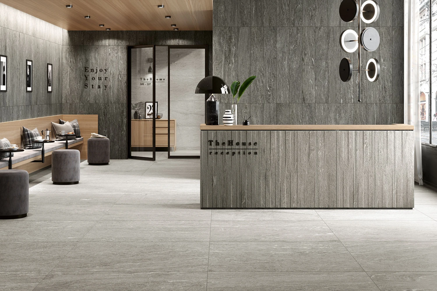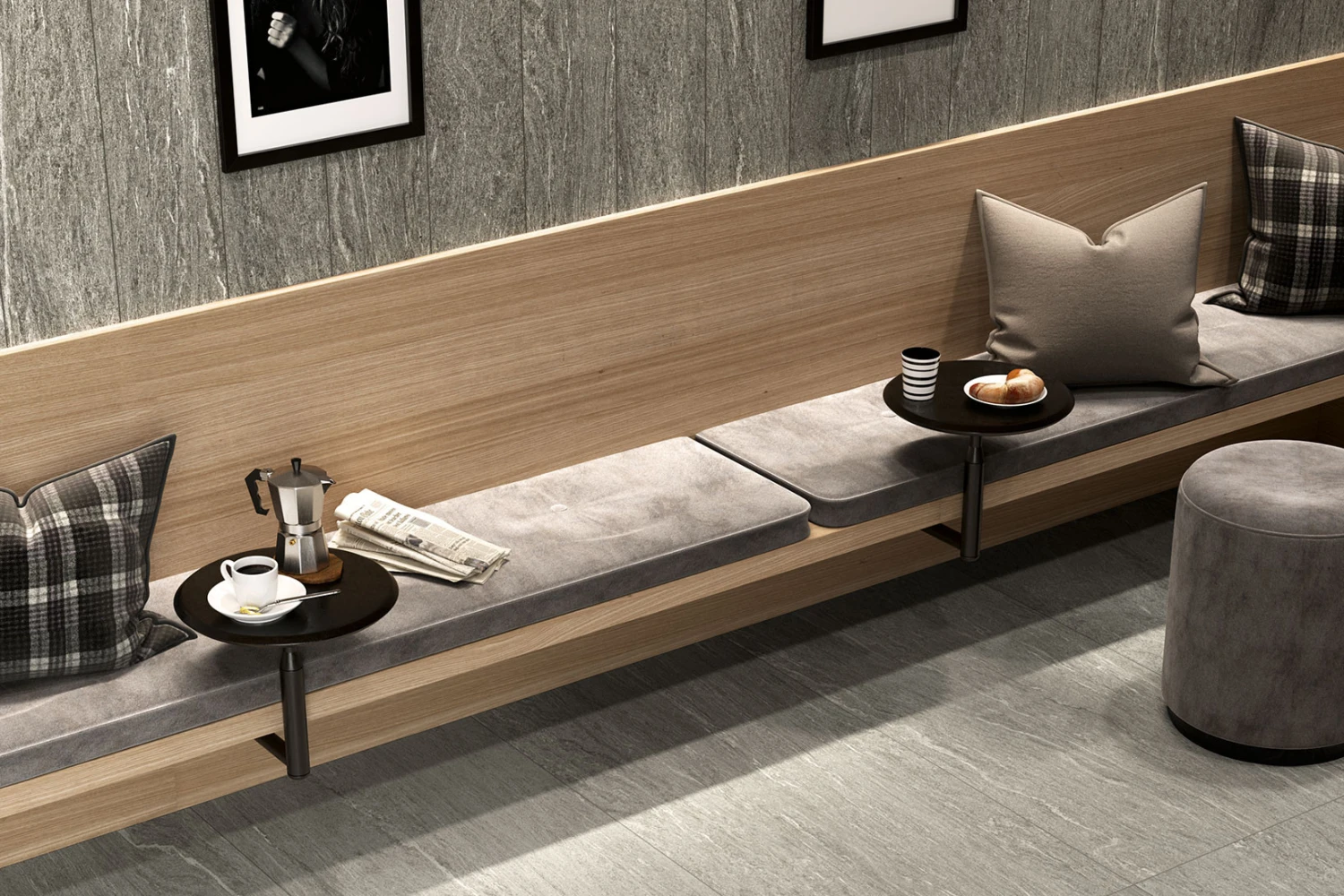 Cette collection s’inspire du projet des Termes de Vals de Peter Zumthor qui suit la logique du « less is more » et qui rend la pierre protagoniste dans son matiérisme. Elle interprète la texture graphique particulière de cette pierre et la rend utilisable pour ceux qui souhaitent s’entourer d’une beauté naturelle tout en recherchant aussi une matière céramique résistante et fonctionnelle, au graphisme d’impact et de caractère. Disponible dans des formats variés pour de multiples solutions de pose, elle est adaptée aussi bien à des espaces intérieurs qu’extérieurs.