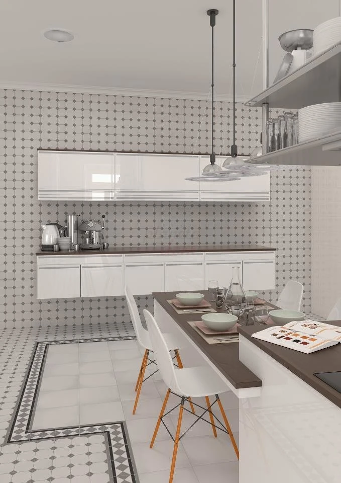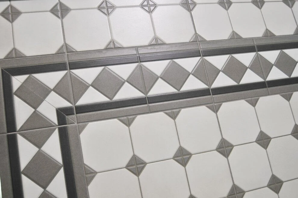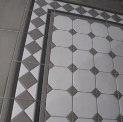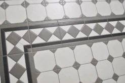 - Type: imitation carreau blanc à cabochon gris. 31.6×31.6cm composé de 9 carreaux (pour un effet 10×10 à cabochons).