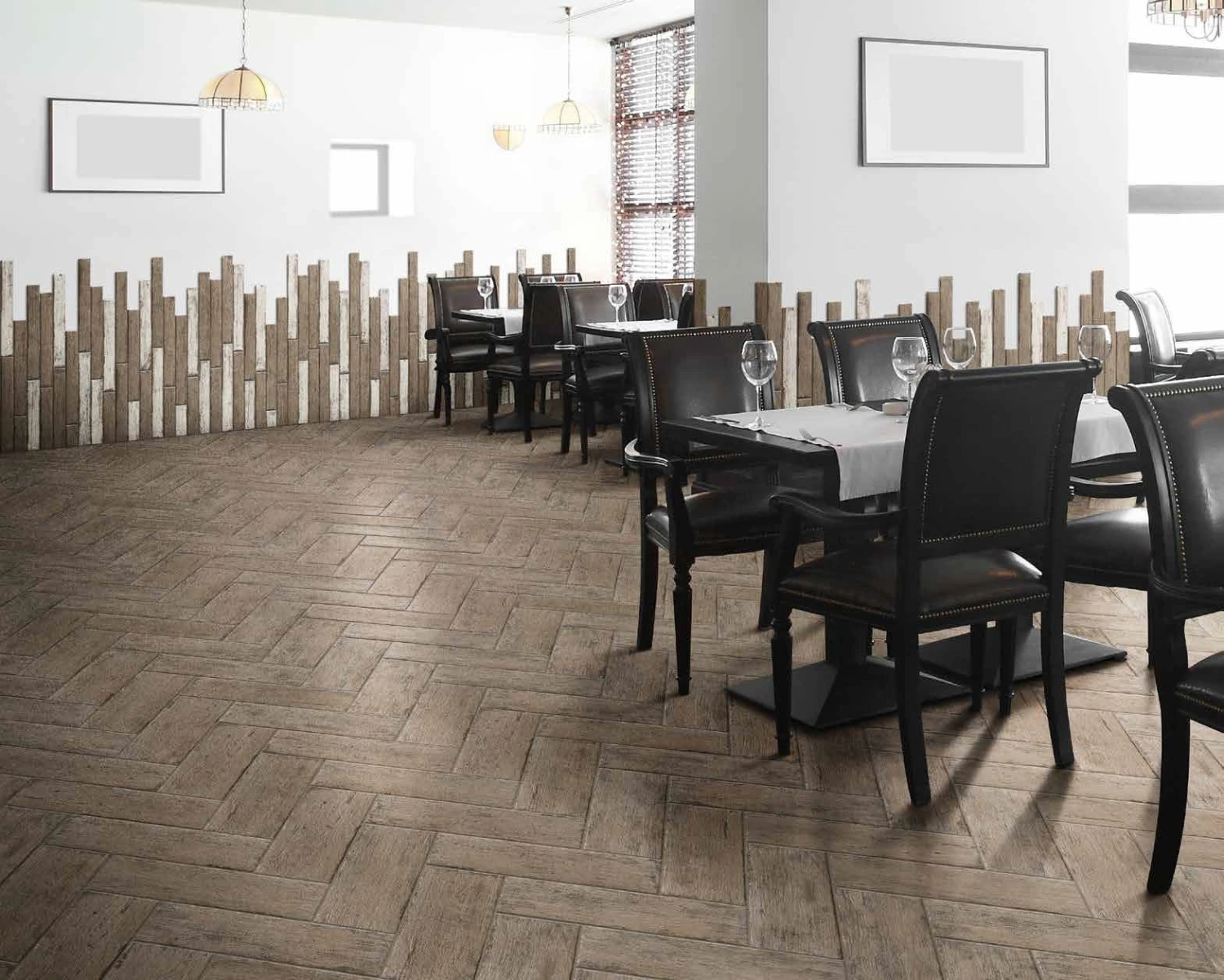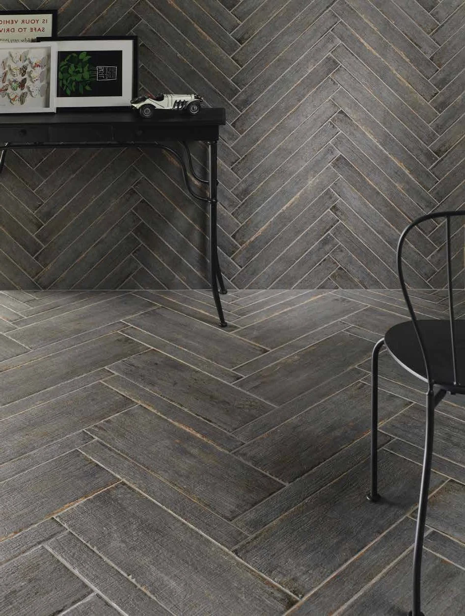 - Aspect: parquet imitation bois vintage style chevron, aspect mat et relief