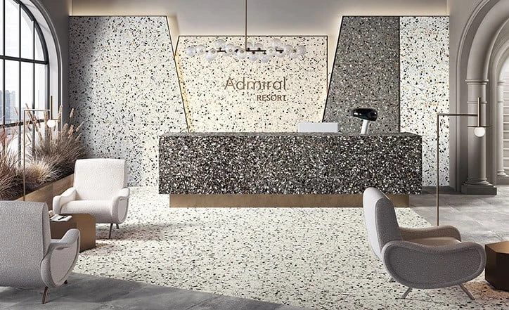 Inspirée par les veines de la lagune vénitienne, cette nouvelle ligne propose six mélanges différents de fragments et d’arrière-plans, formant une collection d’impact esthétique et de richesse visuelle. En plus de 3 nuances de gris avec des tons différents : Rialto, Canal Grande, Giudecca, il y a des blancs : Saint-Marc, Murano et Crème, La Fenice